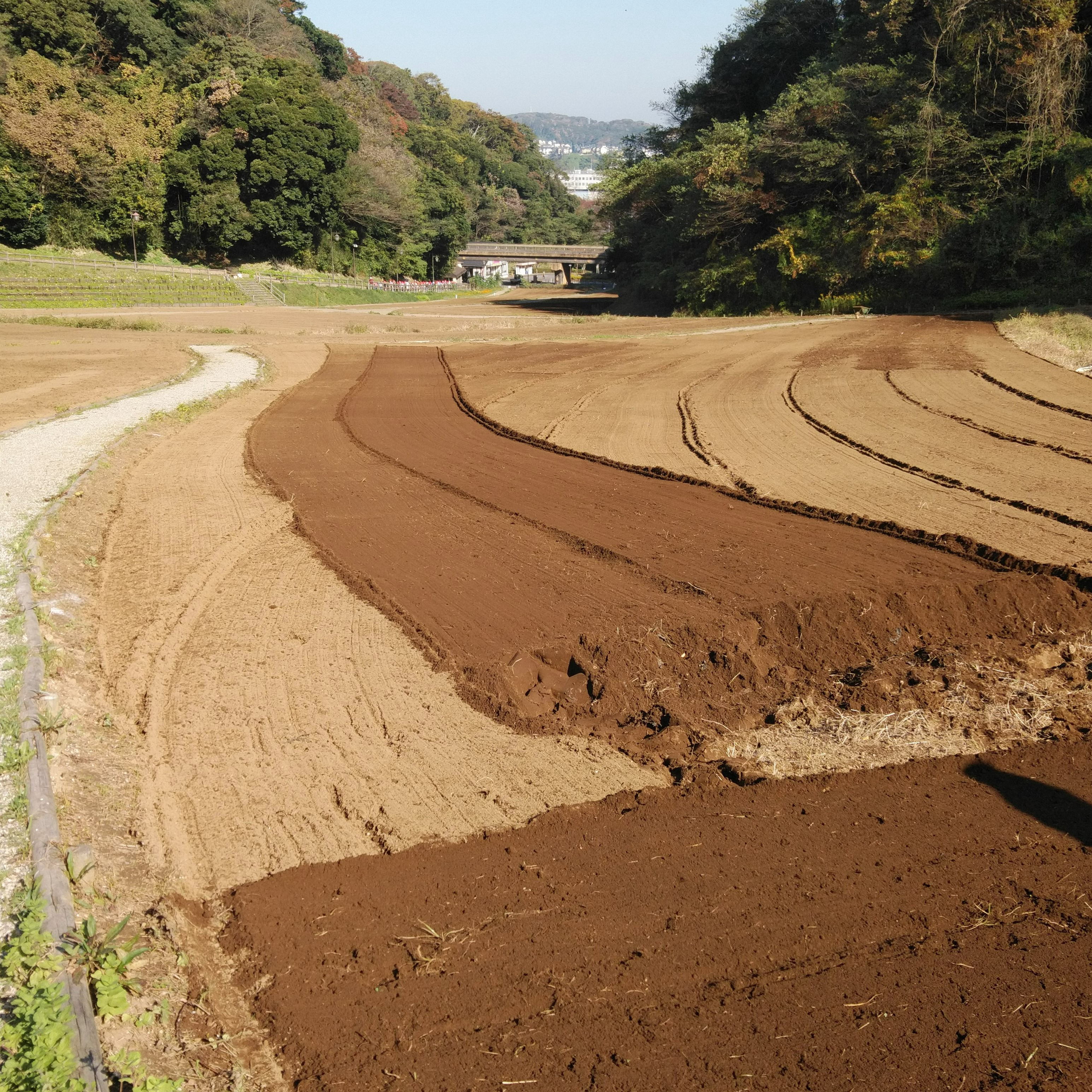 ●土壌作り 大規模花壇ではトラクターによる機械による耕耘作業のあとは、人力による 播種、除草を行い、花を育てています 。